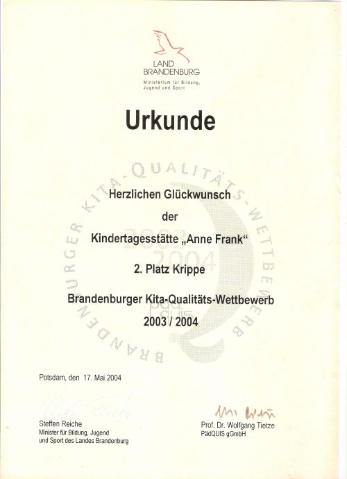 Die Kita „Anne Frank“ in Cottbus belegt in der Kategorie „Krippe“ einen zweiten Platz im Kita-Qualitäts-Wettbewerb des Landes Brandenburg.