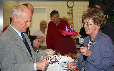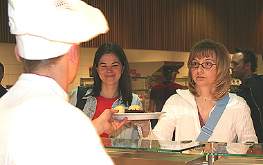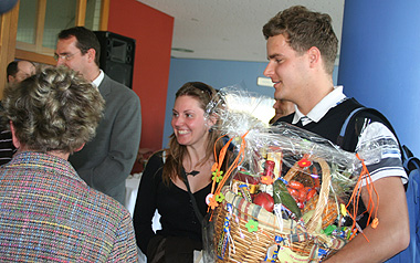 Die Geschäftsführerin des Studentenwerkes, Frau Dr. Ulrike Hartmann, begrüßt den Biotechnologiestudent Christian Ruzanski als 1-millionsten Mittagsgast seit der 1996 abgeschlossenen Sanierung in der Mensa an der FHL in Senftenberg.