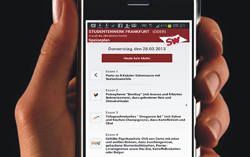 Die Speisepläne der Mensen des Studentenwerkes Frankfurt (Oder) gibt es jetzt auch als App. Sowohl für Android- als auch für iOS-Geräte stehen die Anwendungen zum kostenlosen Download in den Stores bereit. Entwickelt wurde die App von den beiden Studierenden der Hochschule Lausitz Steffen Thurian und Martin Pöschla im Rahmen ihres Masterstudiums.