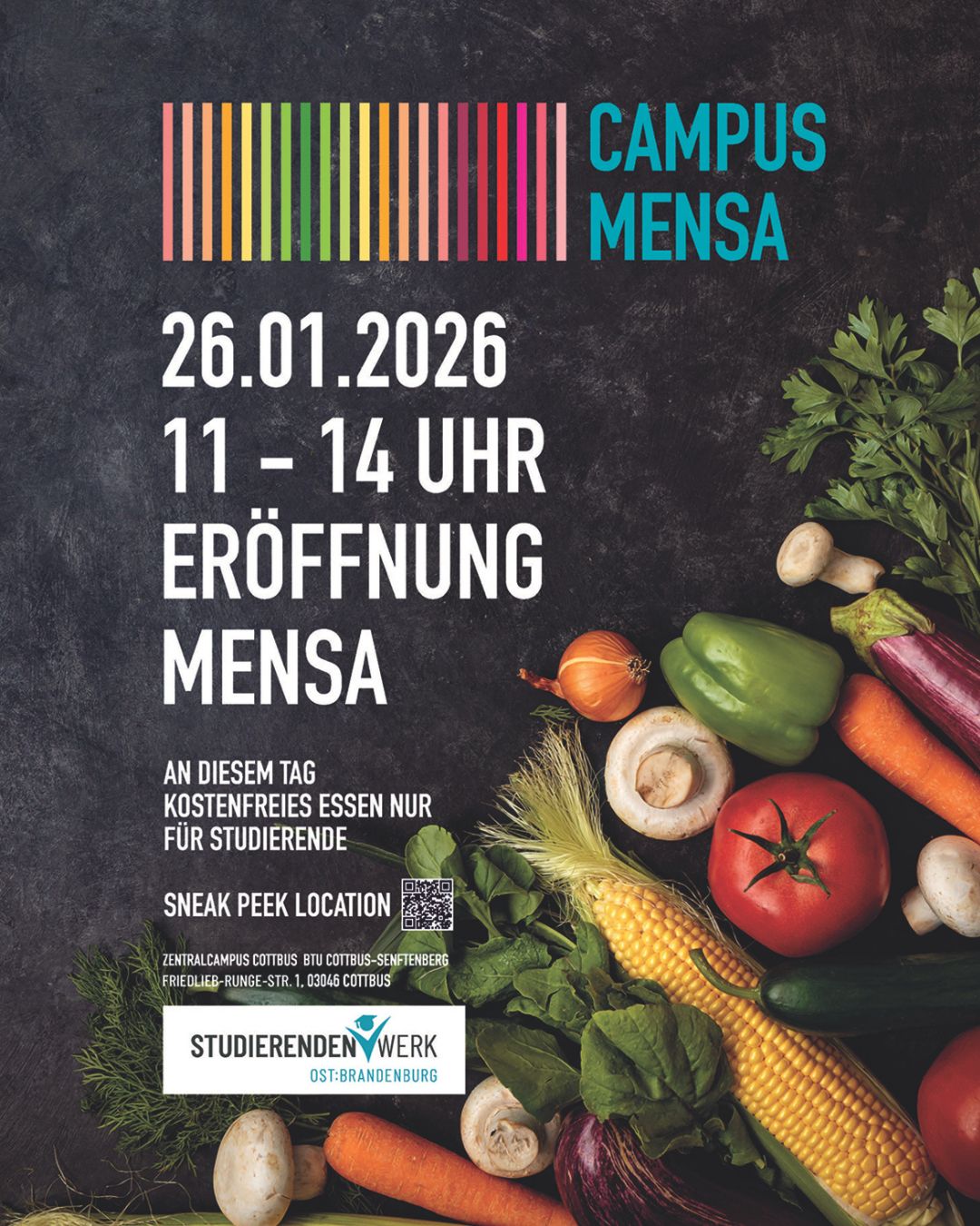 Am Montag, den 26.01.2026 ist es soweit: die neue Campus Mensa am Zentralcampus Cottbus öffnet ihre Türen mit einer Eröffnungsveranstaltung! Kommt vorbei, entdeckt die neuen Räume und probiert Euch durch das Angebot – wir freuen uns auf Euch!
