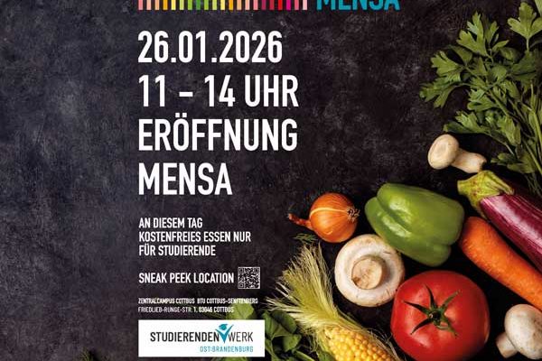 This post is also available in: Jan.242026 Cottbus: Eröffnung CAMPUS MENSA Jan.222026 Wir in den Medien Jan.92026 Cottbus: Mensa Soft Opening Dez.82025 Lust auf einen Quiz-Abend? Dez.32025 Weihnachtstreppenlauf mit Crêpes & Glühwein – jetzt anmelden! Nov.42025 Gestalte unsere Services mit! Okt.72025 Sonderrabatt in der Mensa: Wir unterstützen dich! Juli102025 NahWertVoll im DSW-Journal! Juni232025 Für mehr Tierschutz – unser Fortschrittsbericht zur Masthuhn-Initiative März142025 Studienstarthilfe: 1.000 € für Erstsemesterstudierende aus einkommensschwachen Haushalten Feb.182025 SW:OBB als engagierter Ausbildungsbetrieb ausgezeichnet Feb.102025 Aufrufe zur Teilnahme an der Bundestagswahl von HRK, DSW und fzs Jan.172025 DSW-Präsidentin Beate Schücking im Gespräch mit Viadrina-Studentin Laura Noethe Dez.162024 Neuer Verwaltungsrat des Studierendenwerks Ost:Brandenburg konstituiert Okt.162024 Lost im Erstantrag? Sep.102024 Drei-Sterne-Essen in Eberswalde Aug.302024 Starte dein Studium mit der Studienstarthilfe! Aug.122024 Wahlprüfsteine an die Landespolitik Aug.12024 Verbesserungen für das BAföG Juli292024 Servicepoint in Cottbus bis 13.8. geschlossen Einschränkungen in der Warmwasser-Versorgung in Cottbus Juli192024 Öffnungszeiten in der vorlesungsfreien Zeit Juni262024 Studentenwerk Frankfurt (Oder) als Modellregion für Ernährungswende ausgewählt Juni182024 1. Cottbuser Dinner Lecture: Klima. Gesund. Essen. Juni72024 Neuer Speiseplan mit Kantine Zukunft Brandenburg Mai132024 Stammtische 2024 – Kommt vorbei! Apr.22024 Entspannung für Körper & Geist März262024 Frohe Ostern! Feb.132024 Entdecke die MensaTime App: Dein digitaler Speiseplan Jan.302024 Verwaltungsrat wählt neue Geschäftsführerin Jan.252024 Sicherheit in unseren Wohnheimen – Ein gemeinsames Anliegen Jan.122024 Der perfekte Start in den Uni-Tag! Dez.272023 Neujahrsvorsatz: Veganuary mit Unterstützung unserer Mensen Dez.222023 Stille Nacht, heilige Nacht? Dez.152023 Weihnachtliche Schließzeiten Dez.142023 Wir machen eine Pause Dez.142023 Probenraum in Frankfurt (Oder) sucht Musik Dez.62023 Kein Platz für Antisemitismus in unseren Einrichtungen Dez.12023 Willkommen im Weihnachtscafé Nov.292023 Ergebnisse der Mensaumfrage Nov.272023 Energiespar-Challenge: Partykohle statt Braunkohle! Nov.132023 BAföG: Fördersätze erhöhen, Strukturreform jetzt angehen Nov.92023 Macht mit beim „Tuts“-Programm! Nov.92023 Triff dein Studentenwerk Okt.272023 Schnell noch BAföG beantragen Okt.242023 Wer wird „Student:in des Jahres 2024“? Okt.232023 BAföG-Amt blockiert E-Mail-Anhänge Okt.202023 Beitritt zur europäischen Masthuhn-Initiative Okt.172023 Start des Formularcafés an der Viadrina Okt.162023 Ausfall BAföG-Beratung via Telefon Okt.132023 Exklusive BAföG-Beratungstage Okt.62023 BAföG-Informationstour macht Halt in Frankfurt (Oder) Sep.252023 Einschränkungen beim Zahlungsverkehr in Eberswalde Sep.202023 Strom- und Internetpause in der Bernauer Heerstraße Sep.182023 Einschränkungen beim Hausmeister-Service in Eberswalde Sep.142023 Nachhaltig genießen mit Vytal Sep.132023 Kurze Pause Aug.312023 Starkes Signal für Studierende Aug.282023 Sterneküche in Eberswalde Juli272023 „Mahlzeit!“ Juli182023 Unser Live-Chat für Dich Juli122023 Wir kämpfen auf politischer Ebene für eure Zukunft! Juli122023 Geschäftsbericht 2022 einsehbar Juli62023 Erhöhung des Studentenwerksbeitrages ab Wintersemester 2023/24 Juli42023 Haushaltskürzungen beim BAföG Juli42023 Studentenwerk Frankfurt (Oder) nimmt Frankfurter Kindercharta entgegen Juni292023 Aktion: KlimaKitchen in unseren Mensen! Juni272023 Wir suchen Verstärkung! Juni202023 Kein Service am 30.06.2023 Mai172023 Veränderte Öffnungszeiten Mai152023 Wir suchen Verstärkung! Apr.202023 Stromabschaltung im Wohnheim Logenstraße Apr.182023 Triff dein Studentenwerk Apr.132023 Mit Pizza die Welt besser machen… Apr.42023 Treppenlauf in der Logenstraße März272023 Der Heizkostenzuschuss wird ausgezahlt! März32023 Auf der Suche nach einem Kita-Platz? März22023 Es ist in Ordnung, um Hilfe zu bitten März12023 Kinder, kommt zu Tisch! Feb.212023 Die Einmalzahlung kommt Feb.32023 Sanierung Wohnanlage Oderstraße beginnt am 1.7. Jan.162023 Pizza ist Liebe… Jan.42023 Studentische Hilfskräfte in Cottbus gesucht