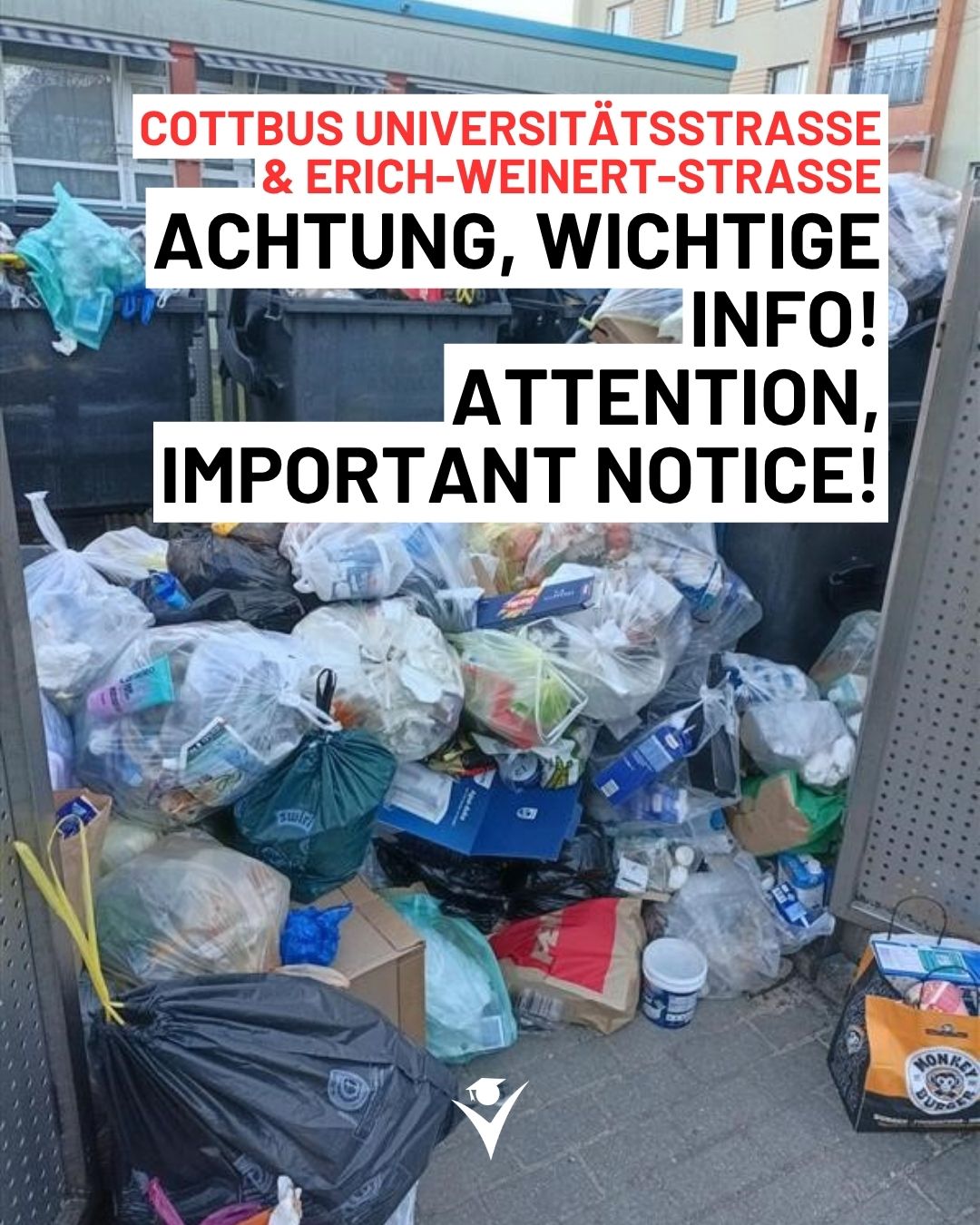 Wichtige Information für Cottbus Universitätsstraße & Erich-Weinert-Straße: Bitte bringen Sie den Müll nicht in den Hof. Aufgrund des Streiks des Entsorgers wird der Müll erst Ende der Woche abgeholt.